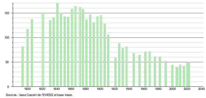 L'évolution du nombre d'habitants est connue à travers les recensements de la population effectués dans la commune depuis 1793. Pour les communes de moins de 10 000 habitants, une enquête de recensement portant sur toute la population est réalisée tous les cinq ans, les populations de référence des années intermédiaires étant quant à elles estimées par interpolation ou extrapolation[17]. Pour la commune, le premier recensement exhaustif entrant dans le cadre du nouveau dispositif a été réalisé en 2005[18].