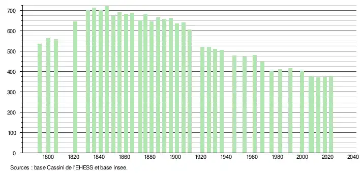 L'évolution du nombre d'habitants est connue à travers les recensements de la population effectués dans la commune depuis 1793. Pour les communes de moins de 10 000 habitants, une enquête de recensement portant sur toute la population est réalisée tous les cinq ans, les populations de référence des années intermédiaires étant quant à elles estimées par interpolation ou extrapolation[24]. Pour la commune, le premier recensement exhaustif entrant dans le cadre du nouveau dispositif a été réalisé en 2007[25].