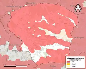 Les mouvements de terrains susceptibles de se produire sur la commune sont des tassements différentiels[38]. Le retrait-gonflement des sols argileux est susceptible d'engendrer des dommages importants aux bâtiments en cas d’alternance de périodes de sécheresse et de pluie[39]. 83 % de la superficie communale est en aléa moyen ou fort (58,6 % au niveau départemental et 48,5 % au niveau national métropolitain)[Carte 4]. Depuis le , en application de la loi ÉLAN, différentes contraintes s'imposent aux vendeurs, maîtres d'ouvrages ou constructeurs de biens situés dans une zone classée en aléa moyen ou fort[Note 5],[40].