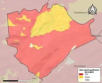 Le retrait-gonflement des sols argileux est susceptible d'engendrer des dommages importants aux bâtiments en cas d’alternance de périodes de sécheresse et de pluie. 99,4 % de la superficie communale est en aléa moyen ou fort (75,2 % au niveau départemental et 48,5 % au niveau national). Sur les 198 bâtiments dénombrés sur la commune en 2019, 198 sont en aléa moyen ou fort, soit 100 %, à comparer aux 94 % au niveau départemental et 54 % au niveau national. Une cartographie de l'exposition du territoire national au retrait gonflement des sols argileux est disponible sur le site du BRGM[29],[Carte 3].