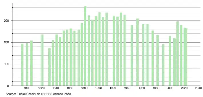 L'évolution du nombre d'habitants est connue à travers les recensements de la population effectués dans la commune depuis 1793. Pour les communes de moins de 10 000 habitants, une enquête de recensement portant sur toute la population est réalisée tous les cinq ans, les populations de référence des années intermédiaires étant quant à elles estimées par interpolation ou extrapolation[36]. Pour la commune, le premier recensement exhaustif entrant dans le cadre du nouveau dispositif a été réalisé en 2005[37].