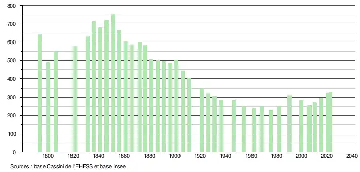 L'évolution du nombre d'habitants est connue à travers les recensements de la population effectués dans la commune depuis 1793. Pour les communes de moins de 10 000 habitants, une enquête de recensement portant sur toute la population est réalisée tous les cinq ans, les populations de référence des années intermédiaires étant quant à elles estimées par interpolation ou extrapolation[17]. Pour la commune, le premier recensement exhaustif entrant dans le cadre du nouveau dispositif a été réalisé en 2005[18].