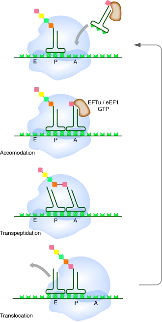 Le ribosome est de plus un moteur moléculaire, qui avance sur l'ARN messager en consommant l'énergie fournie par l'hydrolyse de la GTP. Plusieurs protéines, appelées facteurs d'élongation, sont associées à ce mouvement, appelé translocation.
