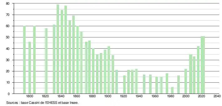 L'évolution du nombre d'habitants est connue à travers les recensements de la population effectués dans la commune depuis 1793. Pour les communes de moins de 10 000 habitants, une enquête de recensement portant sur toute la population est réalisée tous les cinq ans, les populations de référence des années intermédiaires étant quant à elles estimées par interpolation ou extrapolation[23]. Pour la commune, le premier recensement exhaustif entrant dans le cadre du nouveau dispositif a été réalisé en 2005[24].