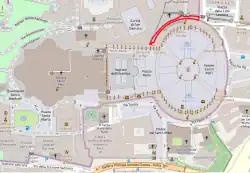 Photographie prise depuis le Ricciolo d'Italia : le sol est en territoire italien, mais la colonnade de la place Saint-Pierre sur la droite et les bâtiments sur la gauche sont au Vatican. | |