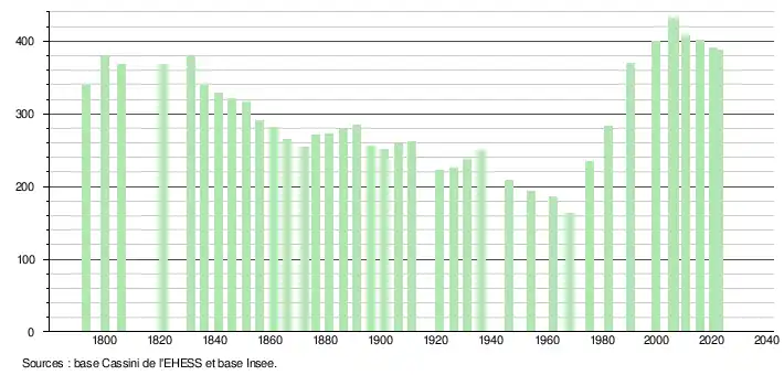 L'évolution du nombre d'habitants est connue à travers les recensements de la population effectués dans la commune depuis 1793. Pour les communes de moins de 10 000 habitants, une enquête de recensement portant sur toute la population est réalisée tous les cinq ans, les populations de référence des années intermédiaires étant quant à elles estimées par interpolation ou extrapolation[33]. Pour la commune, le premier recensement exhaustif entrant dans le cadre du nouveau dispositif a été réalisé en 2005[34].
