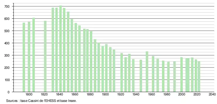 L'évolution du nombre d'habitants est connue à travers les recensements de la population effectués dans la commune depuis 1793. Pour les communes de moins de 10 000 habitants, une enquête de recensement portant sur toute la population est réalisée tous les cinq ans, les populations de référence des années intermédiaires étant quant à elles estimées par interpolation ou extrapolation[16]. Pour la commune, le premier recensement exhaustif entrant dans le cadre du nouveau dispositif a été réalisé en 2008[17].