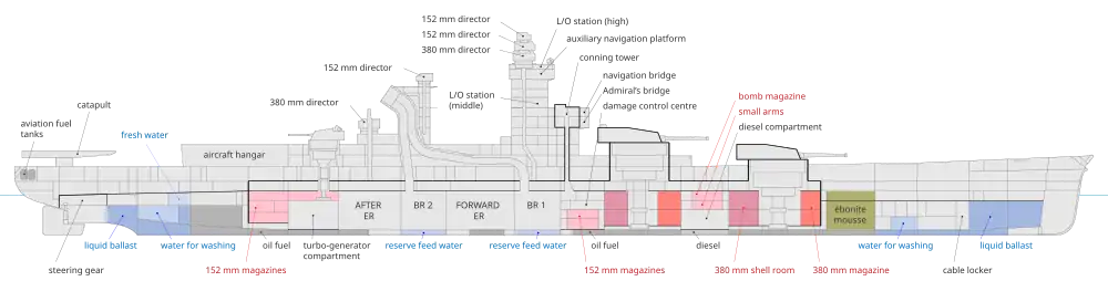 | Blindage | ceinture en acier cémenté Martin de 330 mm (inclinée à 15°24) Premier pont : 24 mm P.B.S. : de 150 à 170 mm P.B.I. : de 40 à 50* mm (*Talus) Tourelles de 380 mm : 430 mm (face avant inclinée à 30°) |