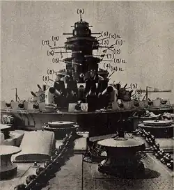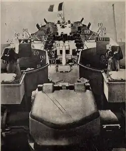 Par ailleurs, en ce qui concerne la silhouette générale, pour la tour avant de la superstructure, on retint le même empilement de trois télépointeurs montés sur un même axe que sur le Dunkerque, ce qui représentait une charge importante dans les hauts. Mais au lieu d'avoir le télépointeur arrière placé sur une tour, derrière la cheminée, on préféra finalement le placer sur une structure constituée par le conduit même de la cheminée, inclinée obliquement vers l'arrière[B 10]. Cette disposition est destinée à minimiser la gêne provoquée par la fumée de la cheminée pour les installations de télépointage, ce dont on a pris conscience en 1937-1938, quand on a modifié les coiffes de la cheminée de la classe Dunkerque. C'est une sorte de préfiguration des macks (en) dont seront dotés après guerre certains navires, comme les croiseurs américains de la classe Baltimore refondus en croiseurs lance-missiles, ou les frégates françaises des classes Suffren ou Tourville, dans les années 1960-1970.