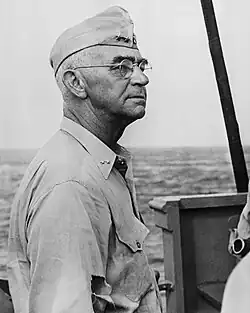 Richmond K. Turner en uniforme de vice-amiral, devant Okinawa en 1945. | ||