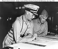 Dès la préparation de l'opération, fin juin, le contre-amiral Turner, qui s'entend bien avec le commandant des marines, le major général Vandegrift, n'est pas d'accord avec le vice-amiral Fletcher sur la couverture du débarquement par l'aviation embarquée[25]. Après la bataille de l'île de Savo, il a fait reproche à Fletcher d'avoir précipitamment retiré les porte-avions[26] et au contre-amiral McCain de ne pas avoir diligenté de reconnaissances aériennes.