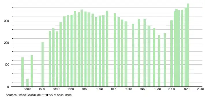 L'évolution du nombre d'habitants est connue à travers les recensements de la population effectués dans la commune depuis 1793. Pour les communes de moins de 10 000 habitants, une enquête de recensement portant sur toute la population est réalisée tous les cinq ans, les populations de référence des années intermédiaires étant quant à elles estimées par interpolation ou extrapolation[18]. Pour la commune, le premier recensement exhaustif entrant dans le cadre du nouveau dispositif a été réalisé en 2004[19].