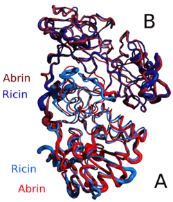 - La chaîne A de la ricine (RTA) est une N-glycoside hydrolase composée de 267 acides aminés[19]. Elle possède trois domaines structuraux avec environ 50 % du polypeptide arrangé en hélices alpha et en feuillets bêta[20]. Les trois domaines forment une fente prononcée qui est le site actif de la RTA.