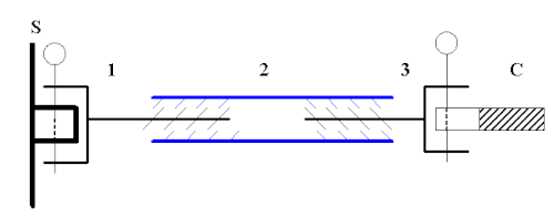 - un premier élément 1, fixé sur une structure S par un dispositif de type manille, se prolonge par une tige filetée ;