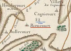 La carte de Cassini ci-dessus montre qu'au milieu du XVIIIe siècle, Riencourt était une paroisse située à l'est du Grand Chemin de Bapaume à Douai, aujourd'hui la route départementale 986.