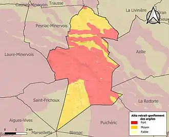 Le retrait-gonflement des sols argileux est susceptible d'engendrer des dommages importants aux bâtiments en cas d’alternance de périodes de sécheresse et de pluie. La totalité de la commune est en aléa moyen ou fort (75,2 % au niveau départemental et 48,5 % au niveau national). Sur les 1 083 bâtiments dénombrés sur la commune en 2019, 1083 sont en aléa moyen ou fort, soit 100 %, à comparer aux 94 % au niveau départemental et 54 % au niveau national. Une cartographie de l'exposition du territoire national au retrait gonflement des sols argileux est disponible sur le site du BRGM[27],[Carte 3].