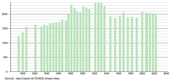 | L'évolution du nombre d'habitants est connue à travers les recensements de la population effectués dans la commune depuis 1793. Pour les communes de moins de 10 000 habitants, une enquête de recensement portant sur toute la population est réalisée tous les cinq ans, les populations de référence des années intermédiaires étant quant à elles estimées par interpolation ou extrapolation[31]. Pour la commune, le premier recensement exhaustif entrant dans le cadre du nouveau dispositif a été réalisé en 2007[32]. En 2022, la commune comptait 1 966 habitants[Note 3], en évolution de −1,35 % par rapport à 2016 (Aude : +2,65 %, France hors Mayotte : +2,11 %). |