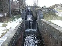 - pour les canaux latéraux, aux rivières qu'elles suivent ; dans ces cas, on cherche la jonction la plus facile et la plus courte à construire pour une alimentation facile à contrôler (un canal doit éviter de subir les effets, parfois dévastateurs, des crues - et, dans les pays nordiques, des débâcles printanières -, alors qu'une rivière ne peut guère y échapper.) Exemple : sur quelque 120 m à 160 de l'écluse 8, là où le canal de Chambly se trouve en surélévation par rapport à la Rivière Richelieu jusqu'au Bassin de Chambly ;