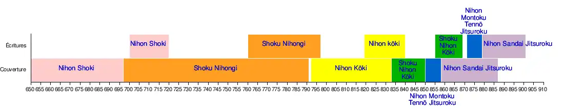 - les Chroniques du Japon (日本書紀, Nihon shoki, 720) : couvre la période allant des origines de la dynastie impériale jusqu'au règne de l'impératrice Jitō ;