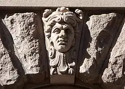 Au-dessus des fenêtres du rez-de-chaussée se trouvent 57 mascarons, portraits sculptés dans la pierre de personnalités choisies par Aron Johansson pour leur rôle dans la construction du bâtiment. Parmi les personnalités ainsi immortalisées, on remarque Gunnar Wennerberg et Aron Johansson lui-même. C'est au sculpteur ornemental G. F. Norling qu'est confiée la tâche de réaliser les modèles des têtes, avant qu'elles ne soient sculptées dans la pierre par la société Norrtelje Mekaniska Stenhuggeri pour servir de clés de voûte aux fenêtres. Ceci se fait tout d'abord sans l'aval de la direction de projet, qui une fois mise au courant réagit avec vigueur : « la réalisation de nouveaux mascarons doit immédiatement cesser, quant à ceux qui figurent déjà sur le bâtiment, il convient de les retailler pour effacer toute ressemblance avec des personnalités connues ». Par la suite, on se contente d'utiliser des copies des mascarons déjà sculptés. C'est ainsi que le directeur de projet Ragnar Törnebladh apparait à quatre reprises sur les façades du bâtiment.