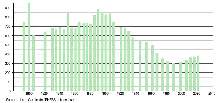 L'évolution du nombre d'habitants est connue à travers les recensements de la population effectués dans la commune depuis 1793. Pour les communes de moins de 10 000 habitants, une enquête de recensement portant sur toute la population est réalisée tous les cinq ans, les populations de référence des années intermédiaires étant quant à elles estimées par interpolation ou extrapolation[28]. Pour la commune, le premier recensement exhaustif entrant dans le cadre du nouveau dispositif a été réalisé en 2007[29].