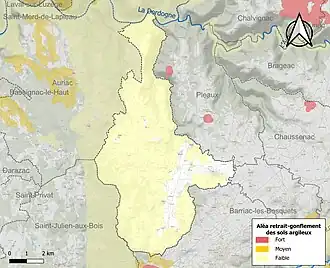 Le retrait-gonflement des sols argileux est susceptible d'engendrer des dommages importants aux bâtiments en cas d’alternance de périodes de sécheresse et de pluie. 0,1 % de la superficie communale est en aléa moyen ou fort (26,8 % au niveau départemental et 48,5 % au niveau national). Sur les 229 bâtiments dénombrés sur la commune en 2019, un est en aléa moyen ou fort, soit 0 %, à comparer aux 36 % au niveau départemental et 54 % au niveau national. Une cartographie de l'exposition du territoire national au retrait gonflement des sols argileux est disponible sur le site du BRGM[15],[Carte 2].