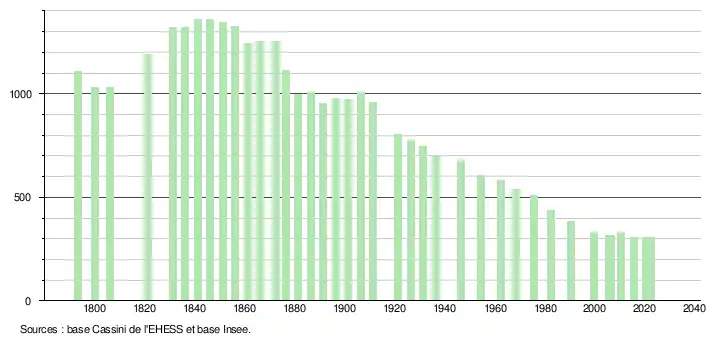 L'évolution du nombre d'habitants est connue à travers les recensements de la population effectués dans la commune depuis 1793. Pour les communes de moins de 10 000 habitants, une enquête de recensement portant sur toute la population est réalisée tous les cinq ans, les populations de référence des années intermédiaires étant quant à elles estimées par interpolation ou extrapolation[21]. Pour la commune, le premier recensement exhaustif entrant dans le cadre du nouveau dispositif a été réalisé en 2005[22].