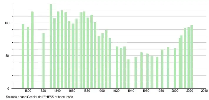 L'évolution du nombre d'habitants est connue à travers les recensements de la population effectués dans la commune depuis 1793. Pour les communes de moins de 10 000 habitants, une enquête de recensement portant sur toute la population est réalisée tous les cinq ans, les populations de référence des années intermédiaires étant quant à elles estimées par interpolation ou extrapolation[16]. Pour la commune, le premier recensement exhaustif entrant dans le cadre du nouveau dispositif a été réalisé en 2008[17].