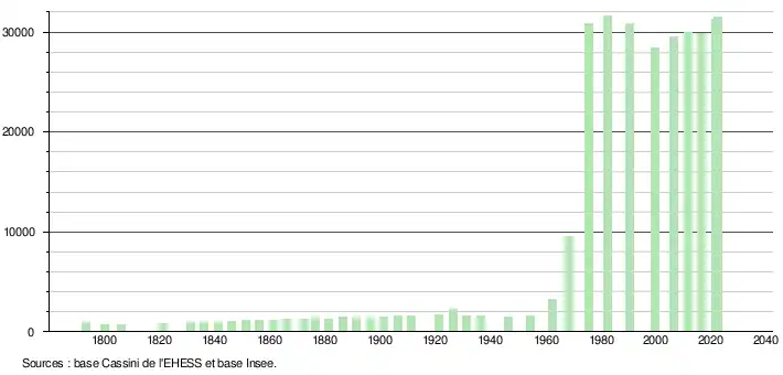- ↑ Par convention dans Wikipédia, le principe a été retenu de n’afficher dans le tableau des recensements et le graphique, pour les populations de référence postérieures à 1999, que les populations correspondant à une enquête exhaustive de recensement pour les communes de moins de 10 000 habitants, et que les populations des années 2006, 2011, 2016, etc. pour les communes de plus de 10 000 habitants, ainsi que la dernière population de référence publiée par l’Insee pour l'ensemble des communes.