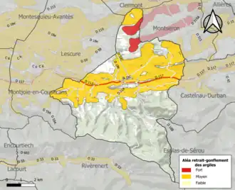 Les mouvements de terrains susceptibles de se produire sur la commune sont soit des chutes de blocs, soit des glissements de terrains, soit des effondrements liés à des cavités souterraines, soit des mouvements liés au retrait-gonflement des argiles. Près de 50 % de la superficie du département est concernée par l'aléa retrait-gonflement des argiles, dont la commune de Rimont[28]. L'inventaire national des cavités souterraines permet par ailleurs de localiser celles situées sur la commune[29].