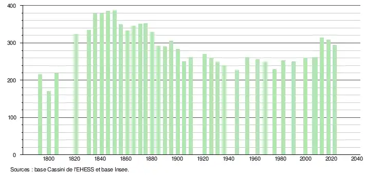 L'évolution du nombre d'habitants est connue à travers les recensements de la population effectués dans la commune depuis 1793. Pour les communes de moins de 10 000 habitants, une enquête de recensement portant sur toute la population est réalisée tous les cinq ans, les populations de référence des années intermédiaires étant quant à elles estimées par interpolation ou extrapolation[18]. Pour la commune, le premier recensement exhaustif entrant dans le cadre du nouveau dispositif a été réalisé en 2007[19].