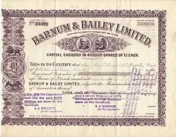 Action de la Barnum and Bailey Ltd en date du .