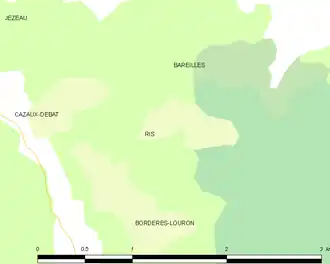 La petite commune de Ris se trouve située sur un coteau à quatre kilomètres de Bordères chef-lieu de canton, à quarante kilomètres de Bagnères et soixante de Tarbes. Elle est bornée au nord nord-est par la commune de Bareilles, à l'ouest par le village de Cazaux-Debat et au sud sud-est par la commune de Bordères. Son territoire a une étendue de 180 hectares.