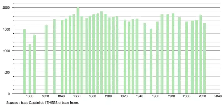 | L'évolution du nombre d'habitants est connue à travers les recensements de la population effectués dans la commune depuis 1793. Pour les communes de moins de 10 000 habitants, une enquête de recensement portant sur toute la population est réalisée tous les cinq ans, les populations de référence des années intermédiaires étant quant à elles estimées par interpolation ou extrapolation[36]. Pour la commune, le premier recensement exhaustif entrant dans le cadre du nouveau dispositif a été réalisé en 2007[37]. En 2022, la commune comptait 1 643 habitants[Note 2], en évolution de −5,95 % par rapport à 2016 (Gers : +1,04 %, France hors Mayotte : +2,11 %). |