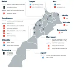 Agadir, Casablanca (3), El Jadida, Essaouira, Fès, Fnideq (Tamuda Bay), Marrakech (2), Meknès, Ouarzazate, Oujda, Rabat, Tanger (2)