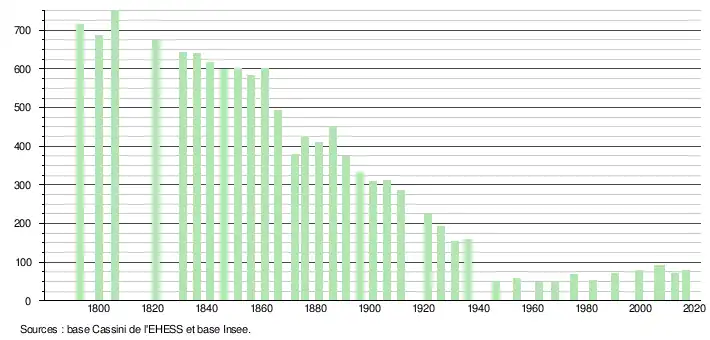 L'évolution du nombre d'habitants est connue à travers les recensements de la population effectués dans la commune depuis 1793. Pour les communes de moins de 10 000 habitants, une enquête de recensement portant sur toute la population est réalisée tous les cinq ans, les populations de référence des années intermédiaires étant quant à elles estimées par interpolation ou extrapolation[5]. Pour la commune, le premier recensement exhaustif entrant dans le cadre du nouveau dispositif a été réalisé en 2007[6].