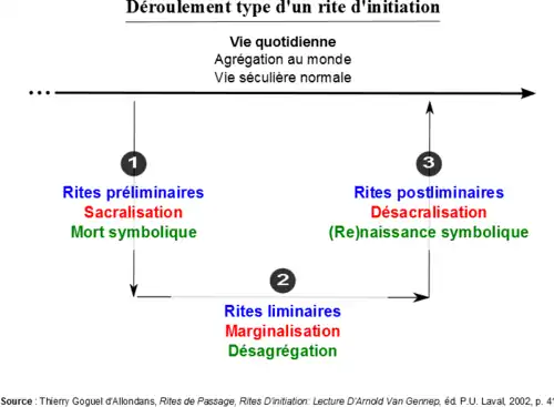 Selon Arnold van Gennep[3], le rite de passage se déroule le plus souvent en trois étapes :