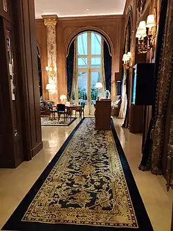 On remarque dans le hall l'escalier d'honneur restauré en 1976 par l'ébéniste Roland Kursner, pièce rare qui contribue à l'élégance des lieux : sa rampe en fer forgé noir est couverte d'une main courante en cuivre et son tapis de marche est retenu par des barres en laiton[35].
