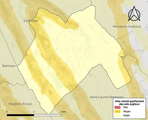Le retrait-gonflement des sols argileux est susceptible d'engendrer des dommages importants aux bâtiments en cas d’alternance de périodes de sécheresse et de pluie[27]. 33,2 % de la superficie communale est en aléa moyen ou fort (59 % au niveau départemental et 48,5 % au niveau national)[Carte 3]. Depuis le , en application de la loi ELAN, différentes contraintes s'imposent aux vendeurs, maîtres d'ouvrages ou constructeurs de biens situés dans une zone classée en aléa moyen ou fort[Note 4],[28].