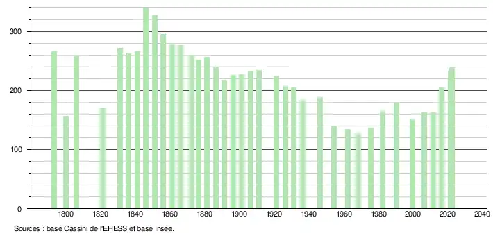 L'évolution du nombre d'habitants est connue à travers les recensements de la population effectués dans la commune depuis 1793. Pour les communes de moins de 10 000 habitants, une enquête de recensement portant sur toute la population est réalisée tous les cinq ans, les populations de référence des années intermédiaires étant quant à elles estimées par interpolation ou extrapolation[39]. Pour la commune, le premier recensement exhaustif entrant dans le cadre du nouveau dispositif a été réalisé en 2006[40].