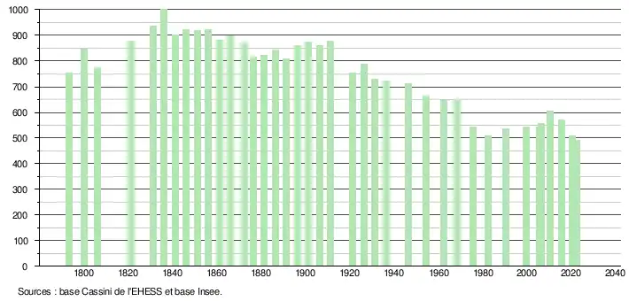 L'évolution du nombre d'habitants est connue à travers les recensements de la population effectués dans la commune depuis 1793. Pour les communes de moins de 10 000 habitants, une enquête de recensement portant sur toute la population est réalisée tous les cinq ans, les populations de référence des années intermédiaires étant quant à elles estimées par interpolation ou extrapolation[32]. Pour la commune, le premier recensement exhaustif entrant dans le cadre du nouveau dispositif a été réalisé en 2005[33].