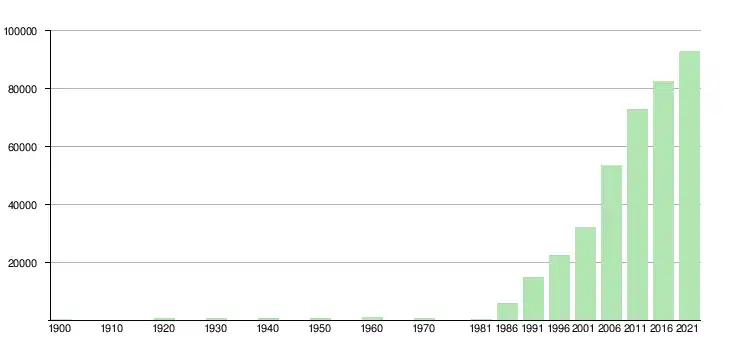 À partir de , Rivas-Vaciamadrid connaît une explosion démographique : elle passe de 641 habitants cette année-là à 15 851 en , puis 35 660 en , 75 444 en , et enfin 96 690 en , soit une augmentation de 15 000 % en quarante ans[7]. Cette très importante augmentation de population s'explique par l'arrivée massive de familles, attirées par la réalisation de très nombreux lotissements de maisons individuelles avec jardin et d'opérations d'habitats collectifs dotées d'espaces verts, combinée au faible coût du logement, à la proximité avec Madrid et au développement d'activités économiques au-delà du secteur agricole[8],[9],[10],[11].