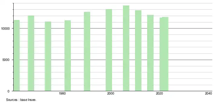 - ↑ Par convention dans Wikipédia, le principe a été retenu de n’afficher dans le tableau des recensements et le graphique, pour les populations de référence postérieures à 1999, que les populations correspondant à une enquête exhaustive de recensement pour les communes de moins de 10 000 habitants, et que les populations des années 2006, 2011, 2016, etc. pour les communes de plus de 10 000 habitants, ainsi que la dernière population de référence publiée par l’Insee pour l'ensemble des communes.