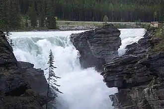 La rivière Athabasca s’écoule sur 1 538 km. Elle reçoit les eaux de la rivière Miette peu avant de sortir du parc national de Jasper. Elle traverse ensuite le lac Brûlé, puis reçoit les eaux de la rivière Pembina avant de se déverser dans le lac Athabasca. La rivière Athabasca a une profondeur de 30 à 40 mètres et un débit moyen de 200 m3 par seconde. Toutefois, ce débit peut être réduit de moitié durant des périodes de sécheresse, comme cela s'est produit trente-six fois au cours des neuf derniers siècles[1].