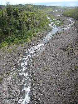 Au pied de cet à-pic, la rivière est réalimentée par des sources qui proviennent en fait de l'infiltration des eaux dans l'épaisseur du massif volcanique. Elle circule ensuite au fond de gorges escarpées et très profondes et ne s'élargit que vers son embouchure où elle dépose des alluvions formées de gros blocs rocheux.