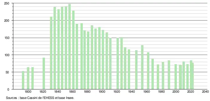 L'évolution du nombre d'habitants est connue à travers les recensements de la population effectués dans la commune depuis 1793. Pour les communes de moins de 10 000 habitants, une enquête de recensement portant sur toute la population est réalisée tous les cinq ans, les populations de référence des années intermédiaires étant quant à elles estimées par interpolation ou extrapolation[15]. Pour la commune, le premier recensement exhaustif entrant dans le cadre du nouveau dispositif a été réalisé en 2005[16].