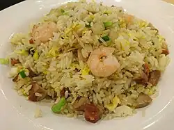 Riz frit hawaïen: cette variété de riz frit, courante à Hawaï, comprend généralement de l’œuf, des oignons nouveaux, des pois, des carottes en dés et de la saucisse portugaise ou du Spam (parfois les deux)[44]. Ce plat est le plus souvent préparé avec de l’huile de sésame. Il existe une variante à l'ananas[45].