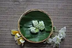 - Klepon (ou onde-onde en Malaisie) : gâteau de farine de riz gluant, rempli de sucre de palme liquide (gula jawa) bouilli, et enrobé de noix de coco râpée servi dans une feuille de bananier, existe en version colorée verte au Pandanus amaryllifolius.