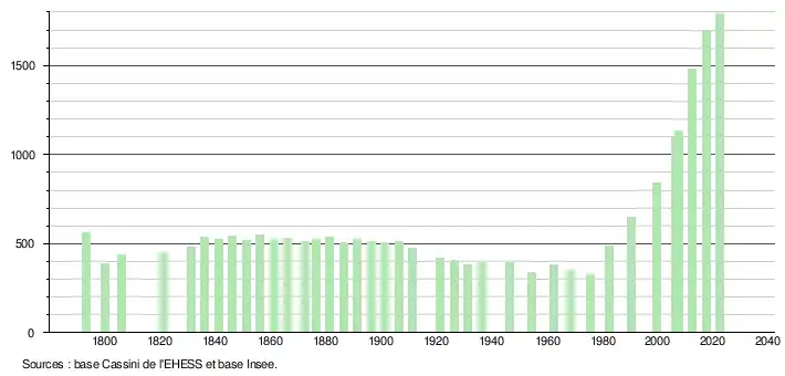 L'évolution du nombre d'habitants est connue à travers les recensements de la population effectués dans la commune depuis 1793. Pour les communes de moins de 10 000 habitants, une enquête de recensement portant sur toute la population est réalisée tous les cinq ans, les populations de référence des années intermédiaires étant quant à elles estimées par interpolation ou extrapolation[27]. Pour la commune, le premier recensement exhaustif entrant dans le cadre du nouveau dispositif a été réalisé en 2007[28].