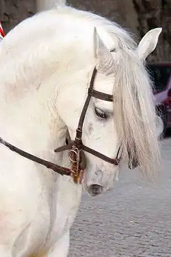 Les véritables chevaux blancs sont extrêmement rares[1]. Leur pelage est uniformément d'un blanc pur, leur peau est rose sans aucune marque (ou très peu), et leurs sabots sont de couleur claire. Ils ne changent jamais de couleur au cours de leur vie. Les yeux peuvent être bleus ou foncés[1].